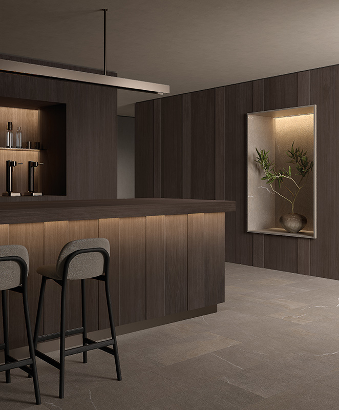 Містить керамограніт у кольорах Pure, Ambpe, Moka та плитку у форматах 120*280, 26,5*180, 20*120, 9*58,5 шеврон у товщині 6мм, 9мм, SKE2.0 20мм з рельєфною поверхнею Deck та декори Light Strip, Dark Strip