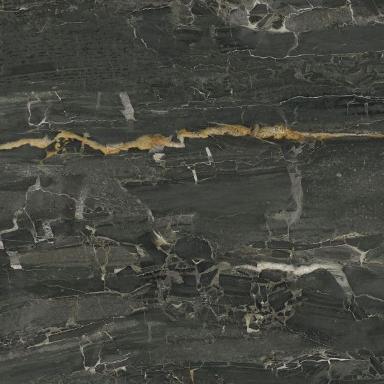 Керамогранітна плитка з ефектом мармуру, глибокого чорного кольору з білими та мідними прожилками.