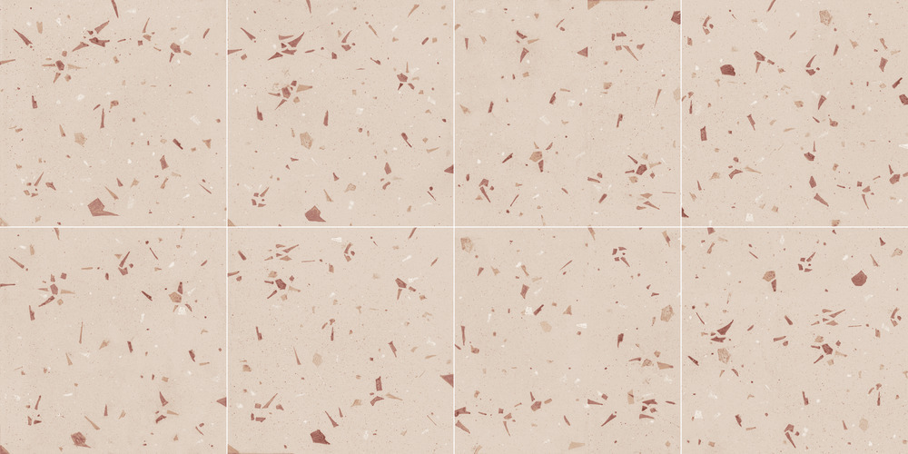 Керамічна плитка формату 20×20 см, яка інтерпретує тераццо з художнім підходом. Цей кораловий відтінок виділяється своїм веселим, але ніжним тоном, з пудровим фоном, на якому ручно нанесені червонуваті фрагменти плавають поряд з тонким глянцевим акцентом. Покриття Soft&Safe забезпечує приємні тактильні відчуття та стійкість до ковзання, що робить її придатною для використання як підлогове покриття, навіть у вологих приміщеннях.