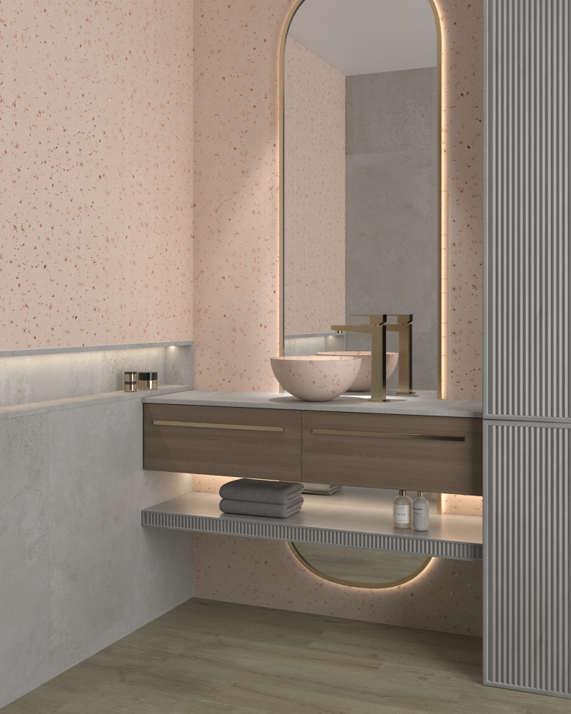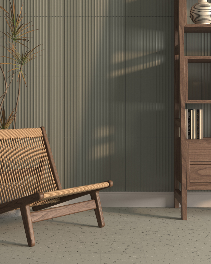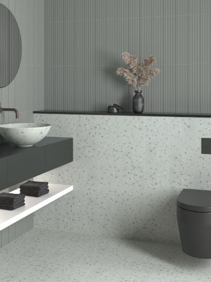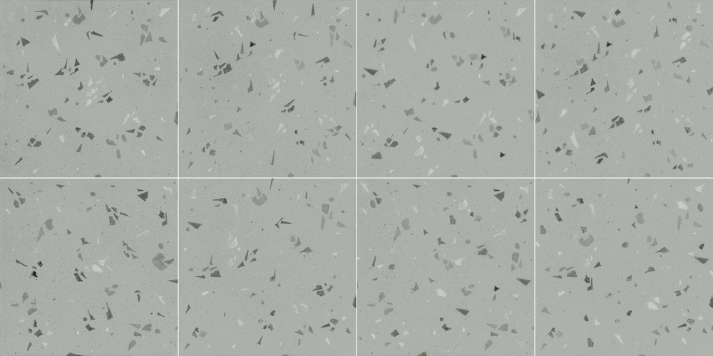 Ця керамічна плитка розміром 20×20 см є новою інтерпретацією класичного тераццо. Завдяки нейтральному сірому фону та ручному розпису фрагментами інших відтінків сірого, ця плитка є одночасно елегантною та універсальною. Її матова поверхня Soft&Safe забезпечує гладкість на дотик та безпеку у вологих приміщеннях.