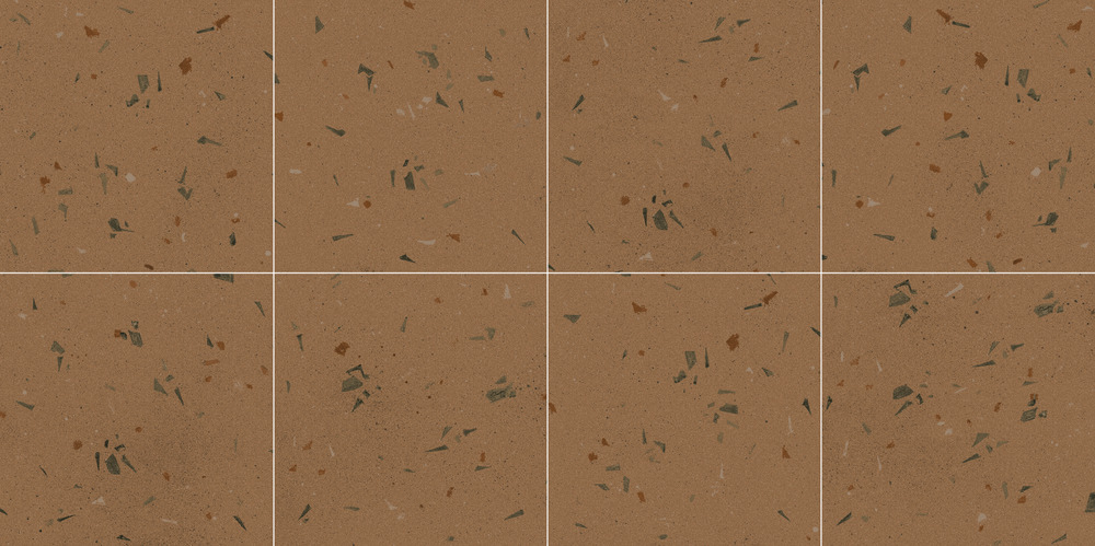 Ця керамічна плитка розміром 20×20 см є ремісничою та високохудожньою інтерпретацією класичного тераццо. Цей відтінок вирізняється сильним візуальним ефектом, що складається з ручно розписаних фрагментів зеленого, червонуватого та бежевого кольорів на інтенсивному, але теплому землистому тлі. Матова глазур Soft&Safe надає плитка шовковистості на дотик, забезпечуючи при цьому повну функціональність та безпеку навіть у вологих приміщеннях.