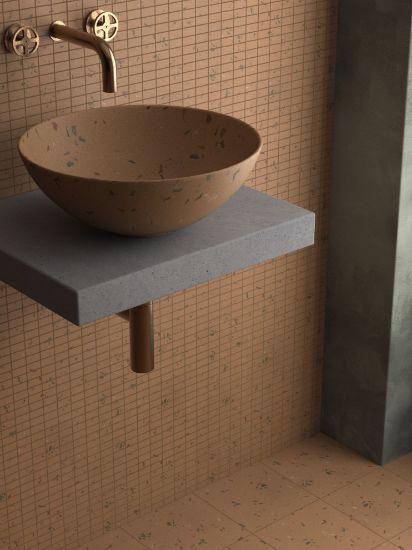 Колекція плитки тераццо 20х20 см керамограніт з монохромним рифленим рельєфом та відповідними умивальниками