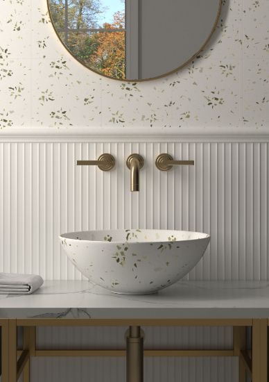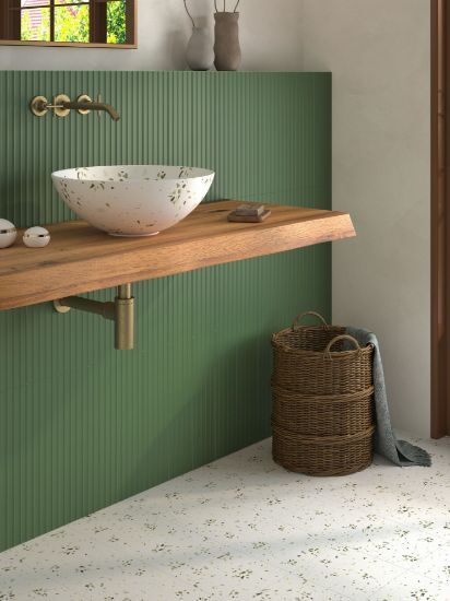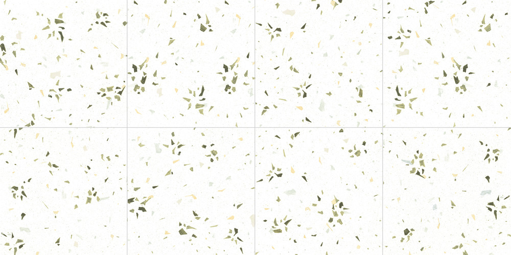 Завдяки художньому підходу, ця керамічна плитка розміром 20×20 см є новою інтерпретацією традиційного тераццо. Ручно розписаний дизайн, де фрагменти рослинних мотивів у різних відтінках зеленого виділяються на білому тлі, нагадує про природу, спокій і свіжість. Матова поверхня Soft&Safe забезпечує шовковисту на дотик і протиковзку поверхню, що робить її придатною навіть для вологих приміщень.