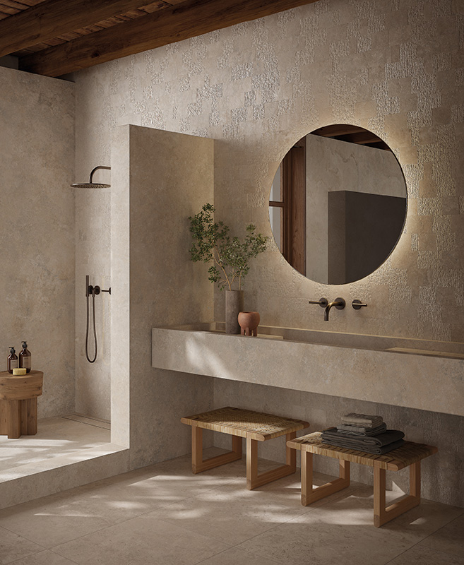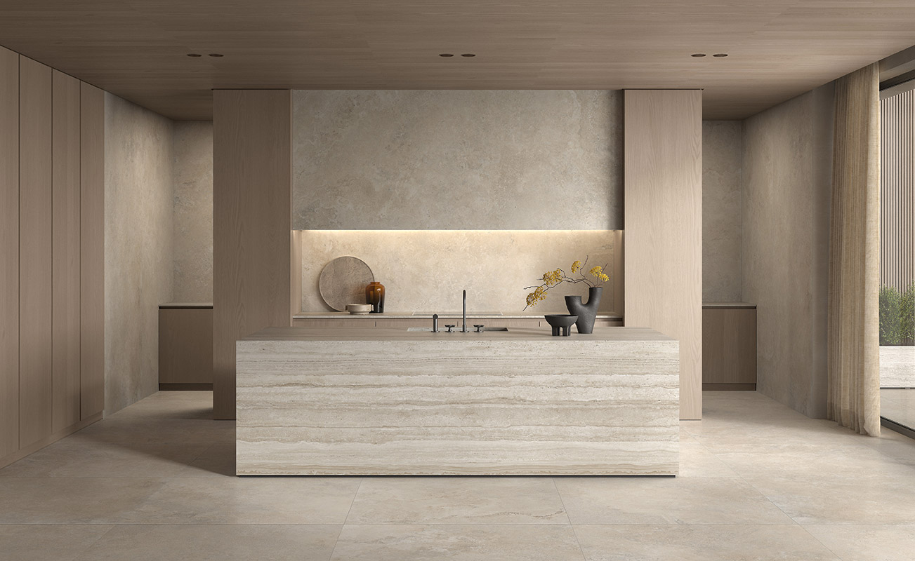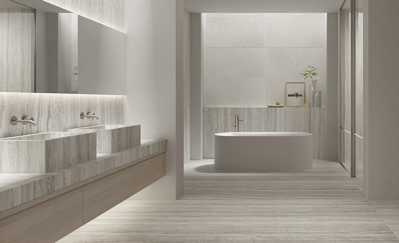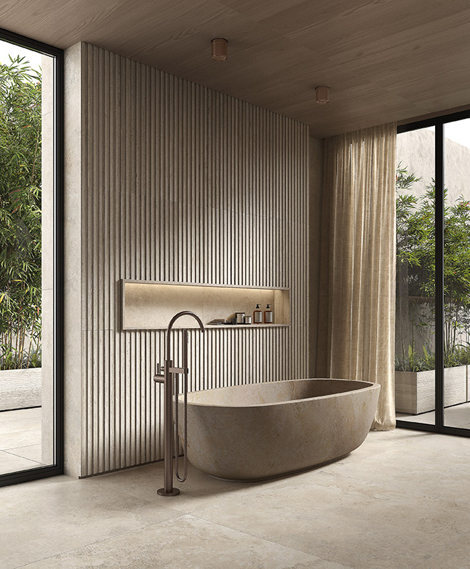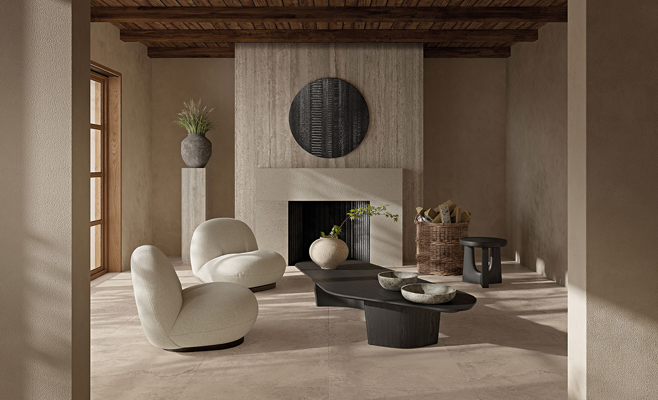Колекція плитки Nativa - діалог між природним світом і людським виміром створив керамограніт з теплою, витонченою красою травертину, позачасового матеріалу, який надає сучасним приміщенням простої елегантності