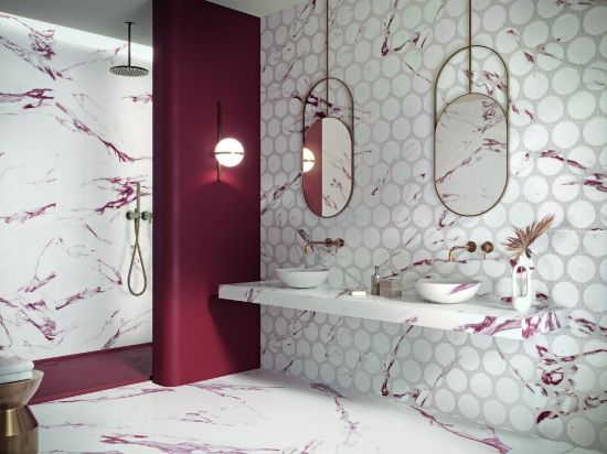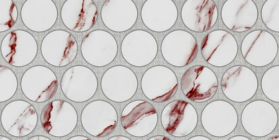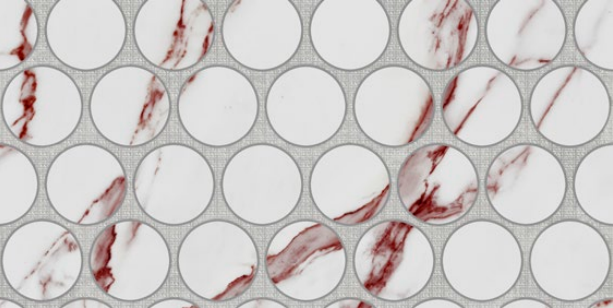 Декоративна плитка, що імітує шпалери. Її дизайн включає кореляційні кола, які поєднуються з мармуровою основою та рубіновими прожилками. Ідеально підходить для використання в сучасних проектах.