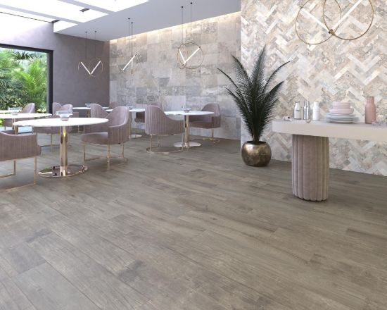 У компактному форматі 22x120 см ця керамічна плитка під дерево вірно відтворює теплі та нейтральні відтінки натурального дуба